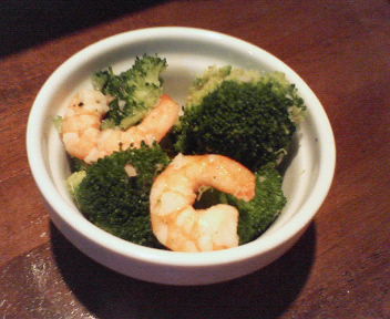 薄いオレンジのエビが新鮮な緑のブリッコリーに映え見た目も可愛い一品。